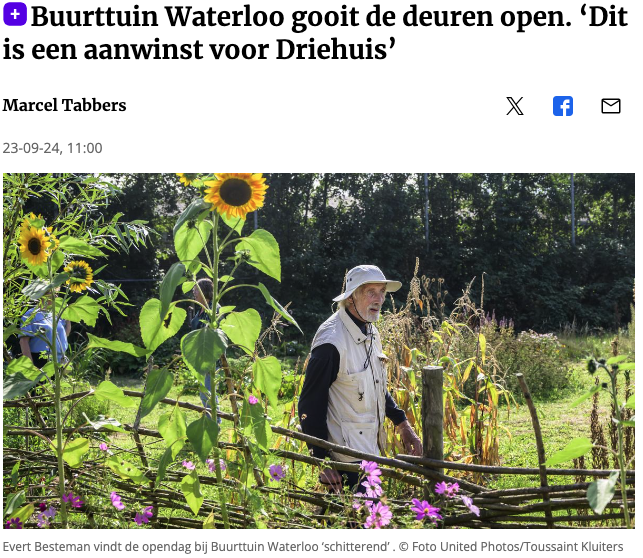 Ijmuider Courant - 'Achter het Pieter Vermeulen museum in Driehuis is een voormalig voetbalveld omgetoverd tot Buurttuin Waterloo. Zondag was de druk bezochte opendag. ‘Ik vind het schitterend’, zegt de 85-jarige Evert Besteman, die zegt altijd zelf bezig te zijn in eigen tuin.'